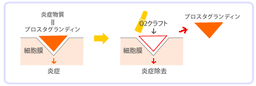 だから、炎症部位にO2クラフトを塗り浸透させると、プロスタグランディンに置き換わり炎症を抑えてしまいます。