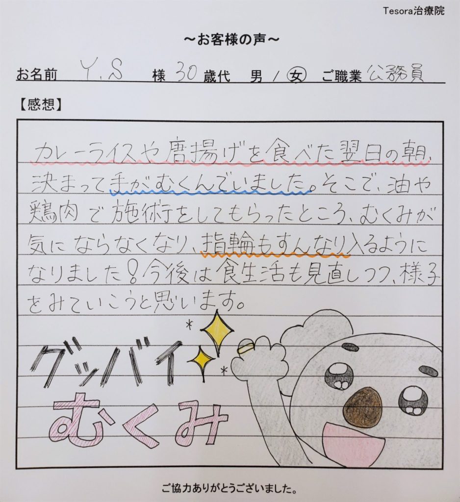 『油っこいもの、鶏肉などを食べても翌日に手のむくみが出なくなりました!』と。