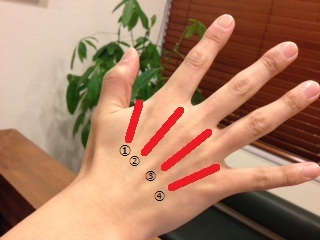 手の甲の骨と骨の間を触ってみてください。(写真の赤いところ)